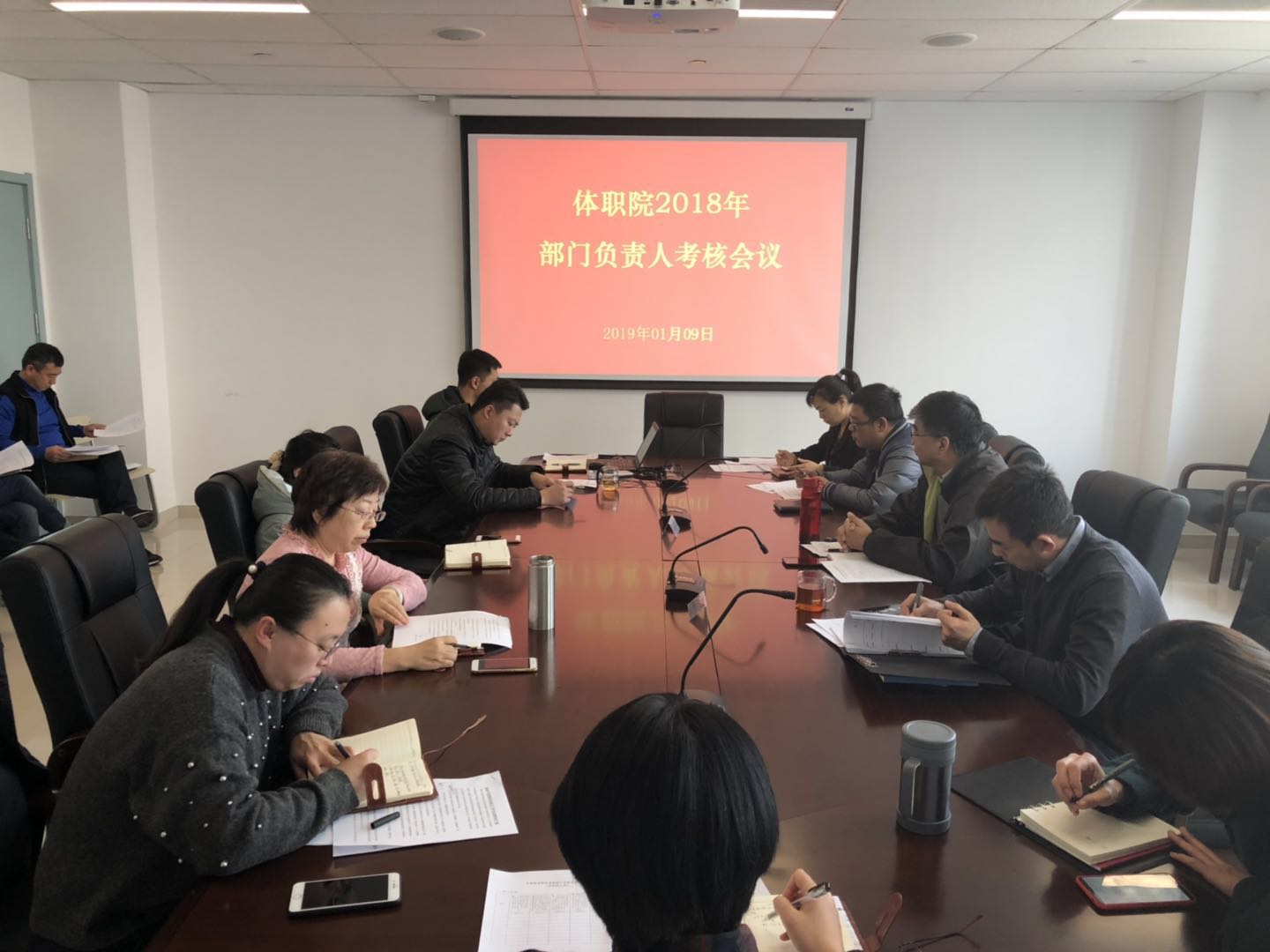 2019年1月9日下午👨🏿🍳,体职院在二楼会议室召开2018年度考核会议,院党委书记王伟、院党委副书记🧖🏿♂️🤞、院长刘钦龙🧖🏼♂️、副院长魏秋月,各处室、系部负责人参会。会议由人事部负责人主持。